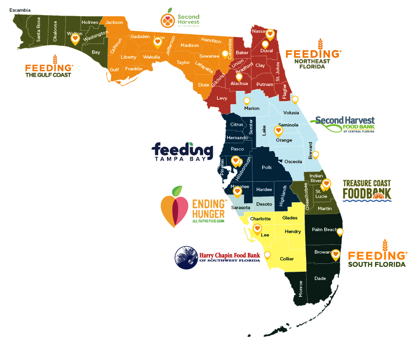 Feeding Florida unites 9 Feeding America member food banks who work with more than 2,400 community-based partner agencies to provide food directly to individuals and families in need in every community every day. To locate a food bank and to see which counties each food bank serves, please see below: