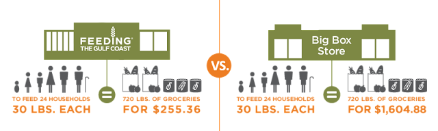When pantries join the food bank network, they see strength in numbers. By working together, food banks and pantries can negotiate food prices on a nationwide scale, share financial and logistical resources, and provide emotional support to food pantry organizers—many of whom are older adults managing demanding programs. (This graphic from Feeding the Gulf Coast shows what a difference this can make.)