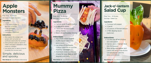 At Feeding Florida, we believe in balance, so we tested a few fun, healthy recipes to help your family enjoy every sweet moment and feel good along the way. Think monster-faced apple slices, mummy pizzas, or pumpkin-shaped cheese bites — kids love foods that look festive, silly, and just a little spooky!