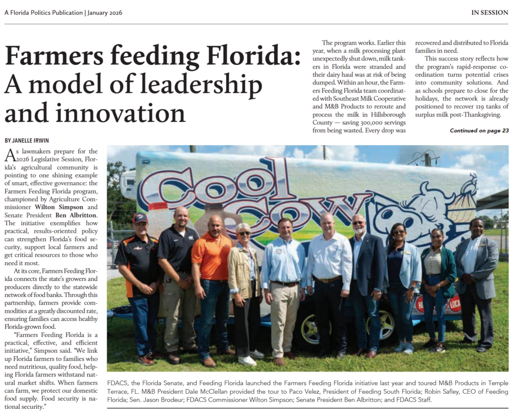 The program works. Earlier this year, when a milk processing plant unexpectedly shut down, milk tankers in Florida milk were stranded and their dairy haul was at risk of being dumped. Within an hour, the Farmers Feeding Florida team coordinated with Southeast Milk Cooperative and M&B Products to reroute and process the milk in Hillsborough County—saving 300,000 servings from being wasted. Every drop was recovered and distributed to Florida families in need.